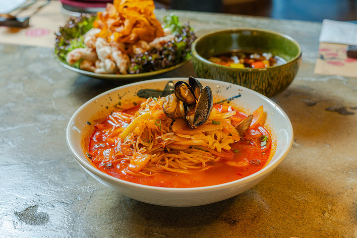 If you prefer something with a little heat, Jjamppong is the dish for you. This fiery noodle soup features a bright red broth made from gochugaru, garlic, and seafood stock. It’s loaded with mussels, squid, prawns, and vegetables, making it a vibrant, hearty meal that awakens the senses.